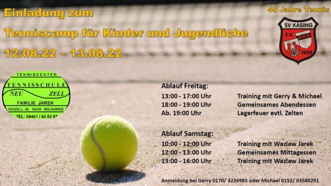 Hiermit laden wir euch recht herzlich zum 1. Kasinger Tennis Camp für Kinder und Jugendliche, vom Fr. 12.08. – Sa. 13.08.22, ein.