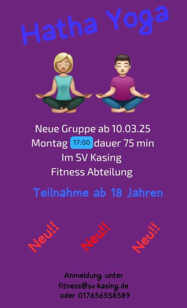 Neue Trainingszeiten für unser Hatha Yoga! 11. Februar 2025 Timo Lackner Allgemein Hallo liebe Mitglieder & Interessierte, die Trainingszeiten für unser Hatha Yoga haben sich wie folgt geändert: Montag: 17.00 – 18.15 Uhr 18.45 – 20.00 Uhr 20.15 – 21.30 Uhr Teilnahmeberechtigt sind alle Frauen & Männer ab 16 Jahren! Teilen mit: Auf Facebook teilen (Wird in neuem Fenster geöffnet) Facebook Auf X teilen (Wird in neuem Fenster geöffnet) X Auf WhatsApp teilen (Wird in neuem Fenster geöffnet) WhatsApp Drucken (Wird in neuem Fenster geöffnet) Drucken